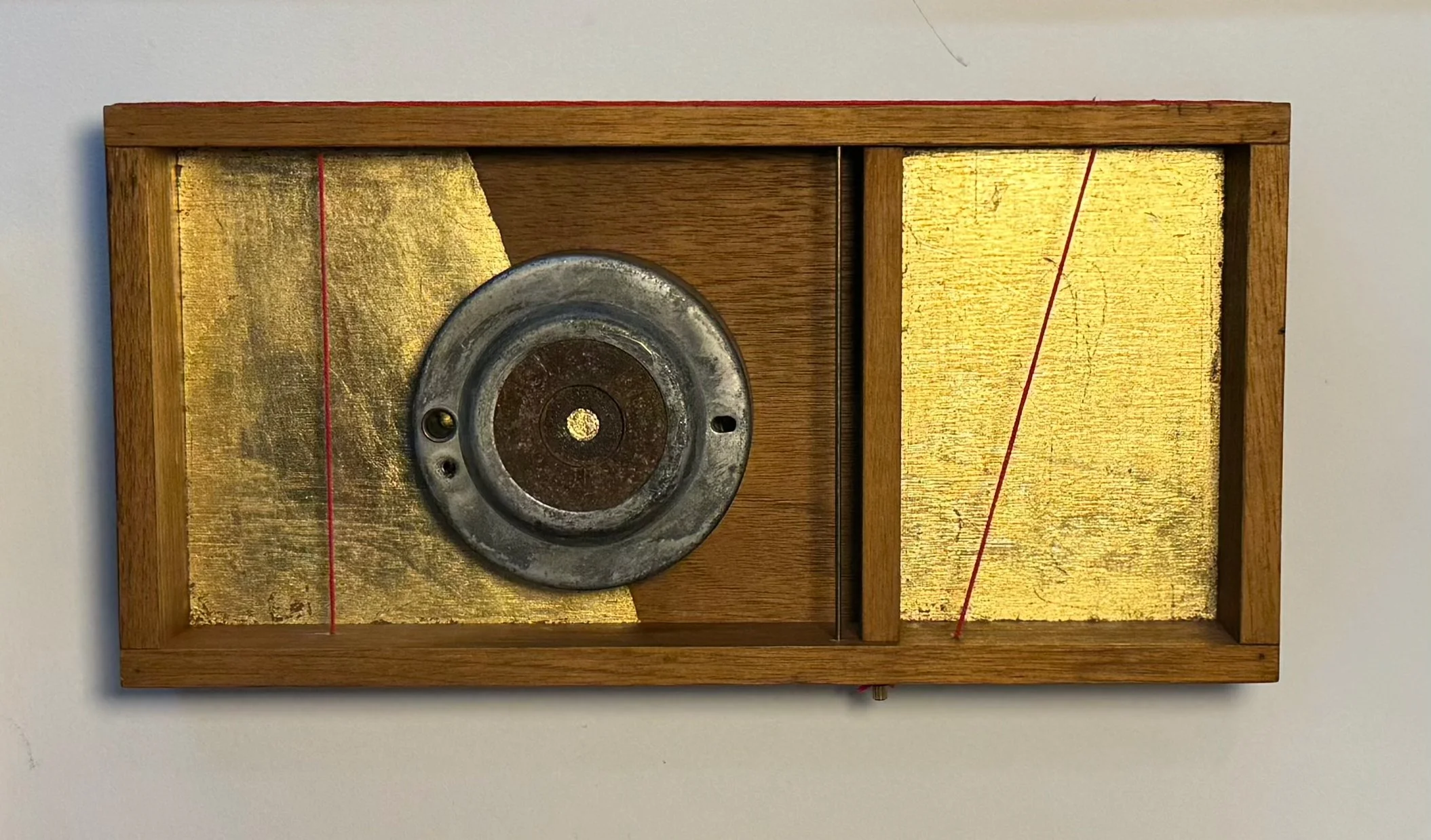 Untitled (drawer 3), 2025. Found objects, gold leaf, thread, 8.5 x 7 x 3 inches.